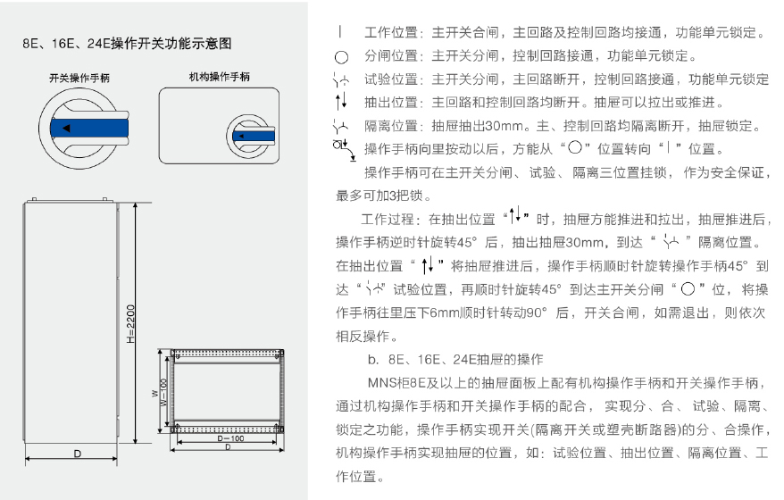 MNS柜的8E/2抽屉和8E/4抽屉配有专用的操作机构,通过安装在抽屉面板上的操作手柄在360°旋转范围内实现开关的分、合、试验隔离、锁定之功能。操作机构上还装有微动开关,作为电气闭锁用。