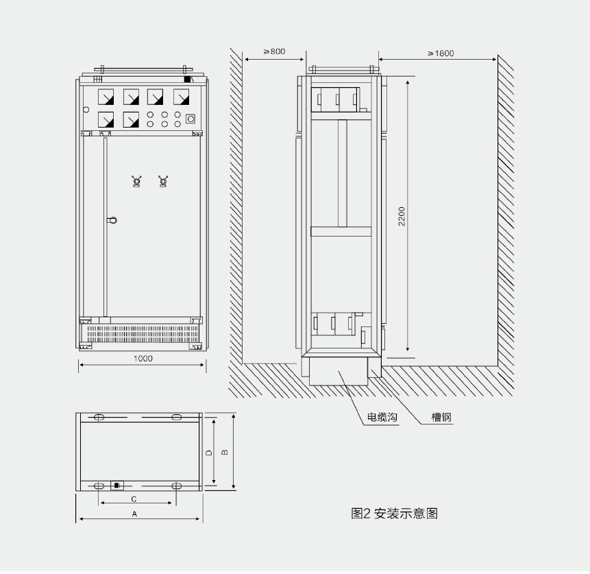 ◇柜体的防护等级为IP30,用户也可根据使用环境的要求在IP20~IP40之间选择。外型及安装尺寸示意图见图1、图2。